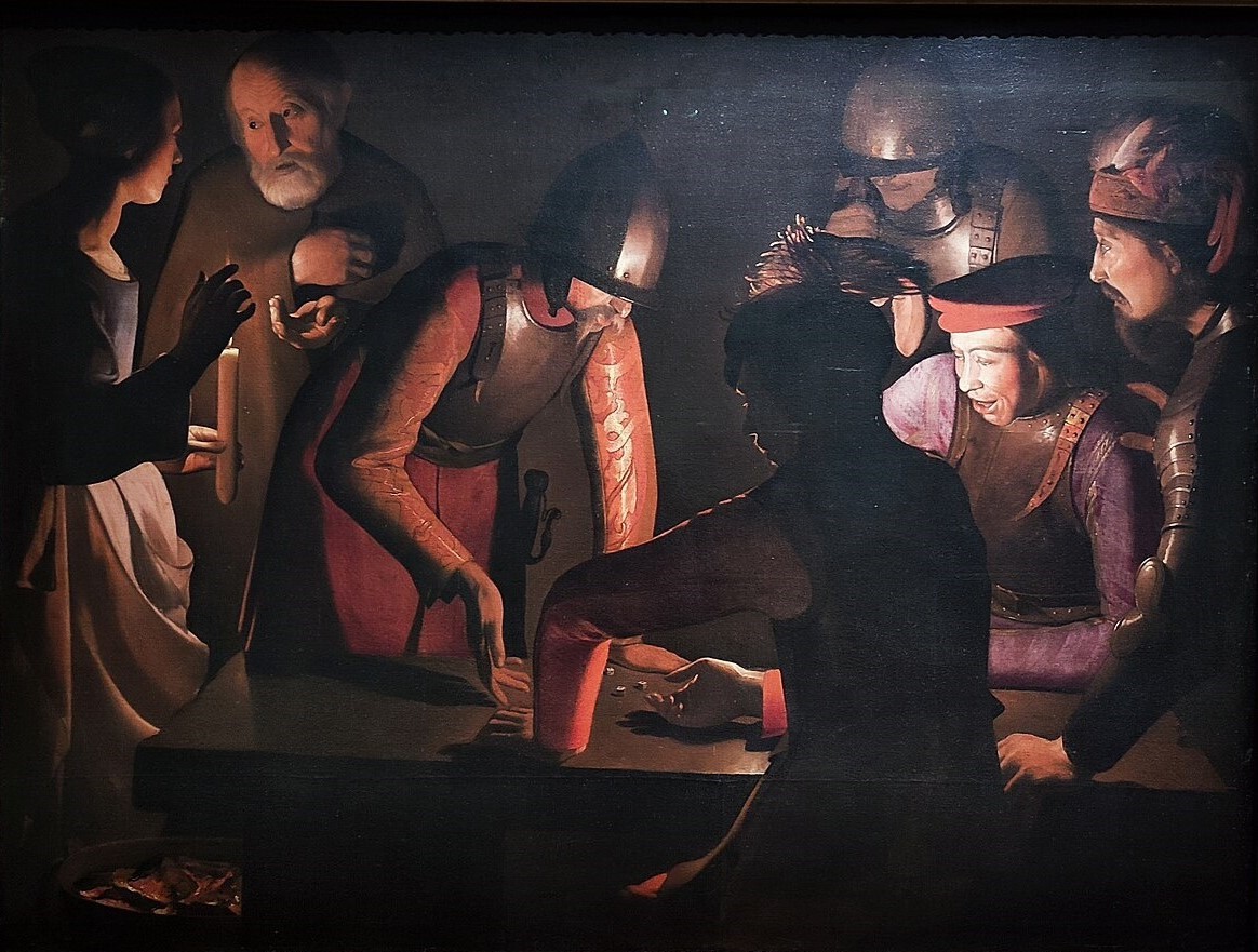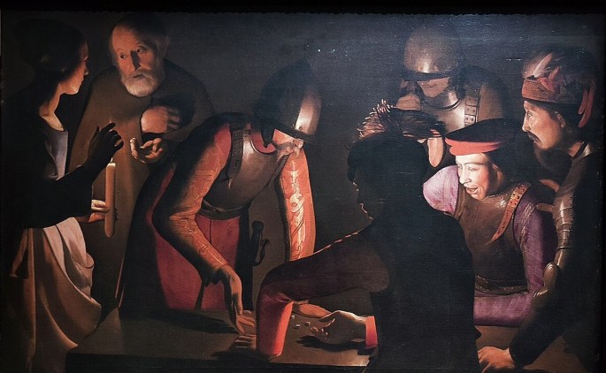 Le Reniement de saint Pierre est réalisé par Georges de La Tour en 1650, sur commande du gouverneur de la Lorraine où il vit et travaille. Le tableau est construit en deux scènes ponctuées par une chandelle. La première est située autour de la servante, la seconde est placée au centre de la table de jeu. La clé de l’œuvre est l’importance donnée aux joueurs. Les soldats s’en remettent au sort quand s’accomplit le pire péché, celui qui consiste à miser sur les biens terrestres, la vie pour Pierre, le désir d’inverser la fortune pour les soldats. En rappelant le geste de la main de Pierre par celle de l’homme assis de dos, le peintre signifie qu’à l’instar des soldats, Pierre est un joueur qui bluffe, triche. On peut aussi lire dans le reniement une préparation de la crucifixion : peut-être que ce seront les mêmes soudards qui tireront au sort les vêtements du Christ crucifié le lendemain.