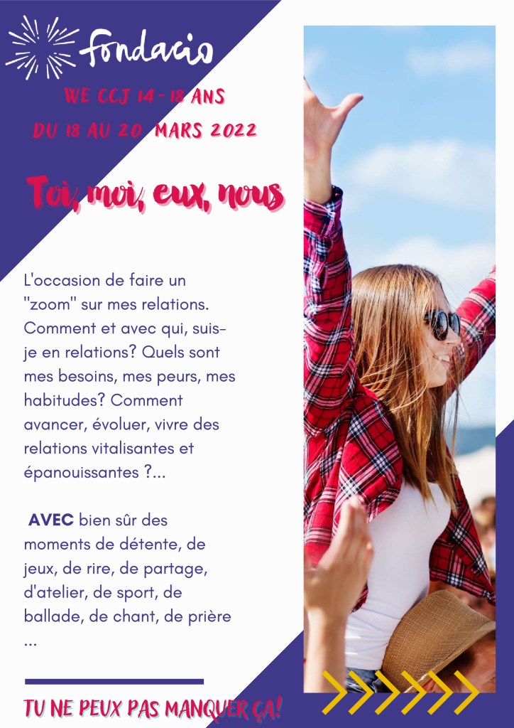 Toi, moi, eux, nous : Fondacio invite les 14-18 ans 11 février 2022 par Anne-Elisabeth, publié dans Pastorale des Jeunes En savoir plus sur Saint-Jean-Baptiste en la Fenêtre de Theux Abonnez-vous pour recevoir les derniers articles par e-mail. Saisissez votre adresse e-mail… Abonnez-vous Évaluez ceci :Si vous aimez, partagez ! Cliquer pour imprimer(ouvre dans une nouvelle fenêtre) Imprimer Cliquer pour envoyer un lien par e-mail à un ami(ouvre dans une nouvelle fenêtre) E-mail Cliquez pour partager sur Facebook(ouvre dans une nouvelle fenêtre) Facebook Cliquer pour partager sur X(ouvre dans une nouvelle fenêtre) X Cliquez pour partager sur LinkedIn(ouvre dans une nouvelle fenêtre) LinkedIn Cliquez pour partager sur Pinterest(ouvre dans une nouvelle fenêtre) Pinterest Cliquez pour partager sur WhatsApp(ouvre dans une nouvelle fenêtre) WhatsApp J’aime chargement…