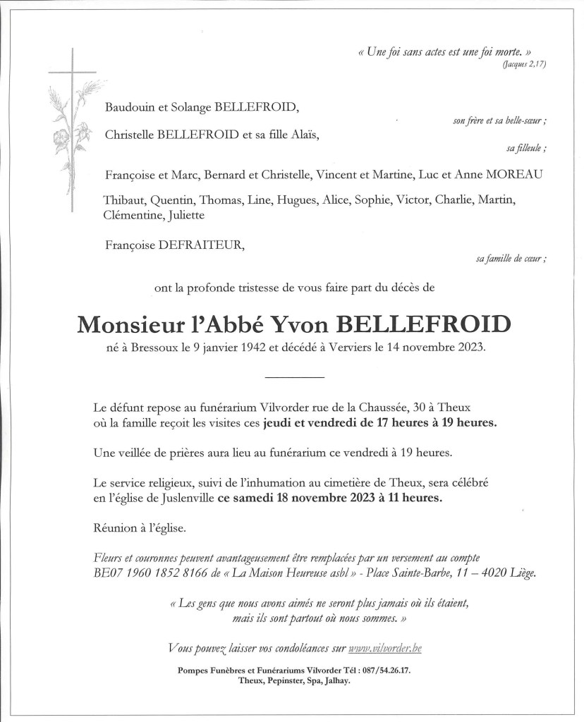 - Yvon repose au funérarium Vilvorder où les visites ont lieu ces jeudi 16 et vendredi 17 de 17h à 19h.
