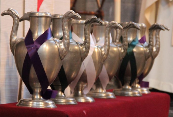 Ces huiles sont ensuite réparties dans les flacons que chaque paroisse a apportés ce soir-là et servent tout au long de l’année liturgique.