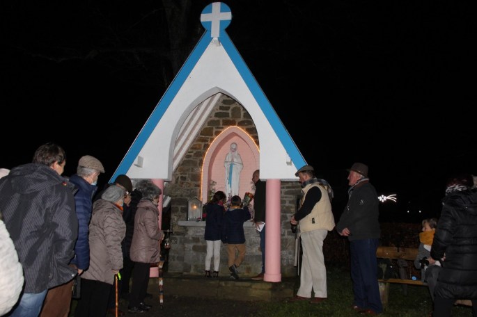 Ce mercredi 15 décembre, à Desnié, la communauté paroissiale (au sens large !) a fêté les 75 ans de la chapelle construite en action de grâce : en effet, en décembre 1944, lors de l’avance von Rundstedt, ultime offensive des armées nazies, le village a été épargné, alors que, à quelques km de Desnié, Stoumont et La Gleize étaient dévastés par les troupes allemandes…