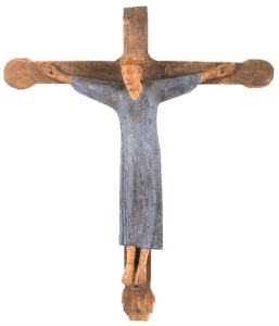Le vieux bon Dieu de Tancrémont, trouvé au début du XIXe s., pourrait être le Christ qui surmontait la poutre de gloire de l’église romane. Les dernières et capitales études de l’Institut Royal du Patrimoine Artistique, réalisées entre 1984 et 1987, concluent, à l’aide du carbone 14, qu’il s’agit du Christ le plus ancien de Belgique. Il date du XIe s. et a été façonné dans un tilleul qui pourrait être du Xe voire du IXe siècle, donc « entre 810 et 965 alors que le bois de la croix est à situer entre 1285 et 1435. »[2] Il a été réparé plusieurs fois au cours des siècles (un bras, une main) et peint en bleu au XIe (reconstitution ci-contre), en doré au XIIe, azur au XIIIe et rouge aux XIVe et XVe siècles.[3]