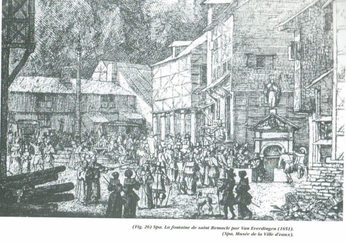 On sait surtout que l’eau sous ses formes de sources, fontaines ou cours d’eau tenait une grande place comme lieux de culte gallo-romains. Ainsi, « aux chrétiens, Césaire d’Arles (VIe s.) défend de s’y rendre pour y faire des vœux, prier et adorer. Les noms de saints chrétiens réputés pour leurs miracles furent substitués à ceux d’Apollon, Diane ou des nymphes, matrones ou déesses associées aux fontaines et à la fécondité. Aussi, il n’est pas étonnant que des sources aient été associées au nom de saint Remacle… La fontaine ou pouhon qui se trouve au centre du bourg porta anciennement le nom de « fontaine de saint Remacle ». « Ortélius, décrivant en 1584 la fontaine située au centre de Spa (appelée Pouhon Pierre-le-Grand au XVIIIe s.) l’appelle la « fontaine acide de Saint Remacle » ce qui peut faire supposer que cette source, dont un poème du XVIIe s. dit que « les femmes stériles, elle les rend fécondes» a pu être une fontaine sacrée. Sur une gravure datant de 1651 représentant le Pouhon, on peut remarquer qu’à cette époque, l’édicule était surmonté d’une grande statue de saint Remacle. »
