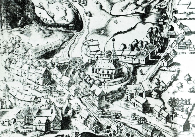 Cette statue est estimée antérieure à 1573. On peut supposer, compte tenu de la première mention du patronage, qu’elle se trouvait dans l’église ou chapelle existant avant 1573. Cette dédicace à saint Remacle aurait donné lieu, au début du XVIIe siècle, à une recherche de reliques du saint auprès de l’abbaye de Stavelot à l’occasion de la consécration, vers 1600, de la nouvelle église par Ernest de Bavière.[1] Cette église pourrait être celle représentée par Valdor en 1603 (voir ci-dessous) et alors achevée à partir des travaux en cours depuis 1573.