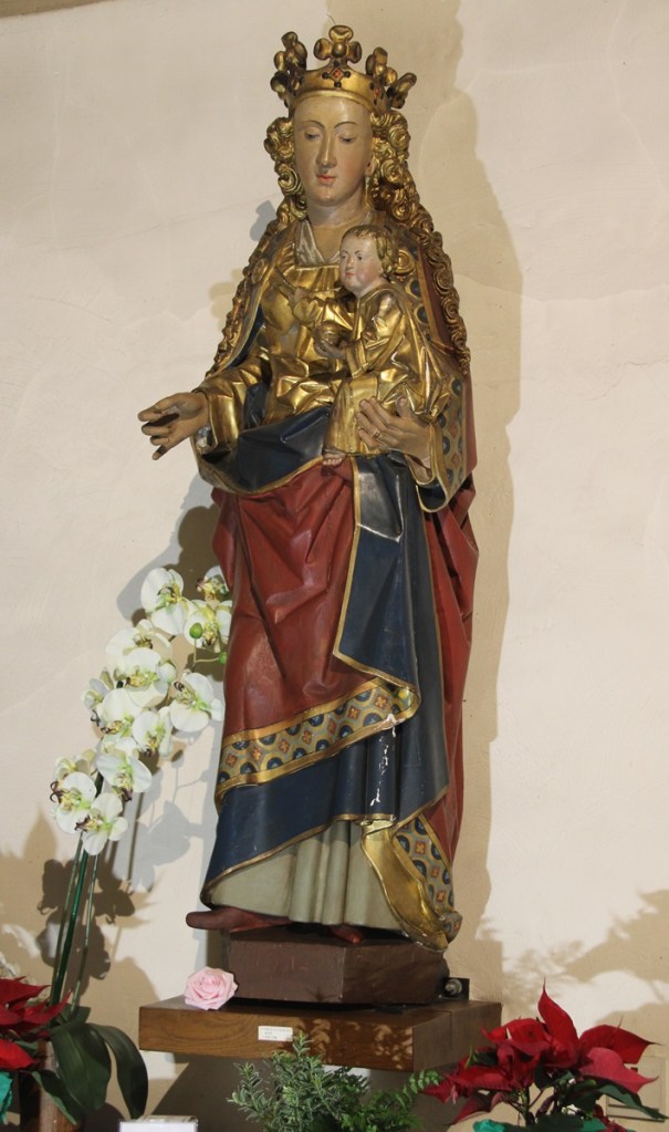 Marie est couronnée, cheveux bouclés et abondants, dénoués et tombant sur les épaules ; elle porte une robe et un manteau, elle a un anneau à la main gauche ; elle a le visage méditant, les yeux baissés sur l’enfant qui est en chemisette et tient le fermoir du manteau maternel de la main droite.