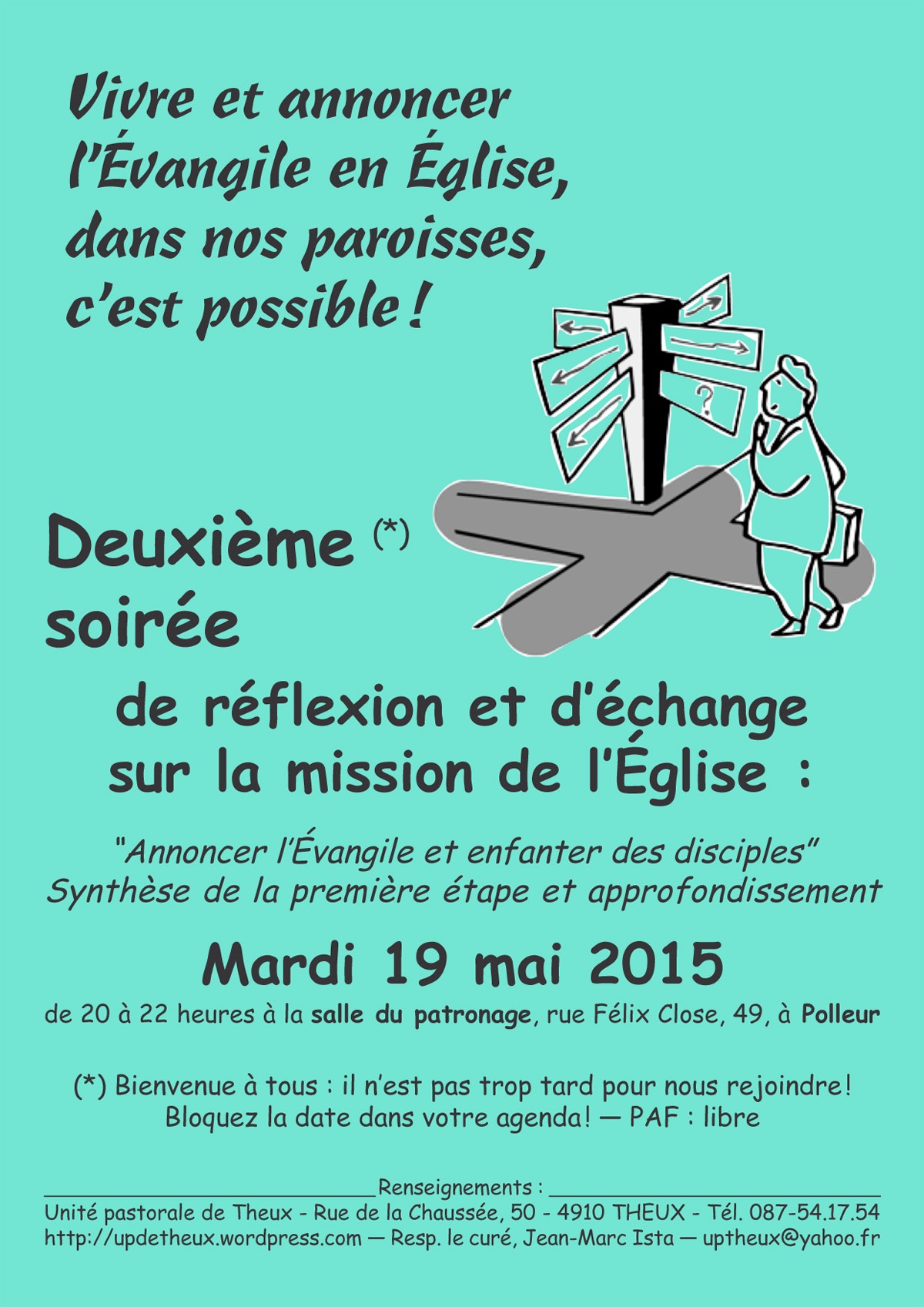 Après l’échange qui s’en est suivi, nous nous sommes quittés en fixant un nouveau rendez-vous, le mardi 19 mai prochain à 20h, cette fois à la salle du patronage de Polleur, non loin de l’église, pour faire écho de la synthèse et approfondir certains points.