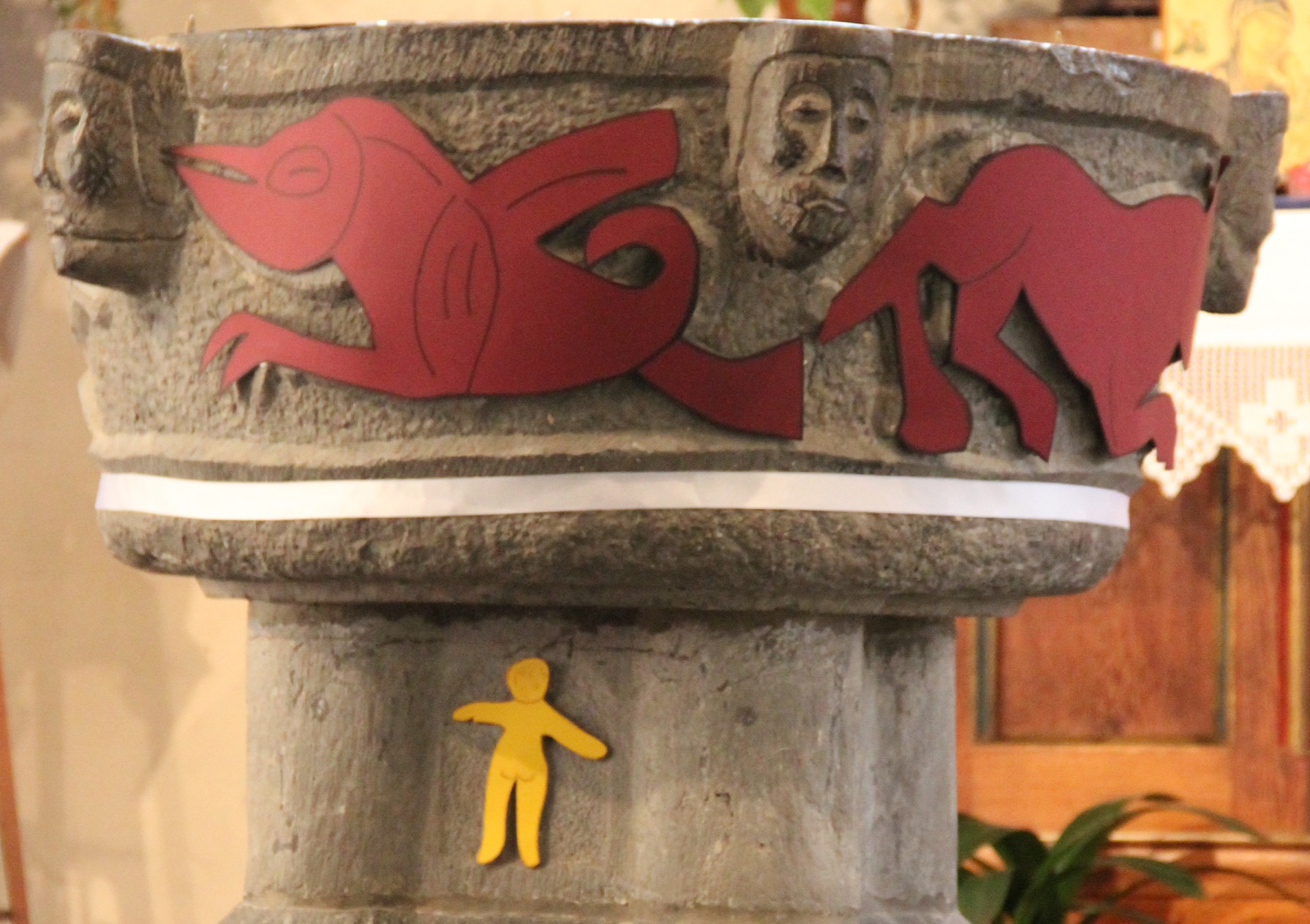 Cet homme nouveau, il est figuré sur le pilier des fonts baptismaux. Nous l’avons aujourd’hui mis en évidence par un cache jaune qui souligne la sculpture en relief de quatre enfants nus, un sur chacune des faces.